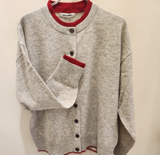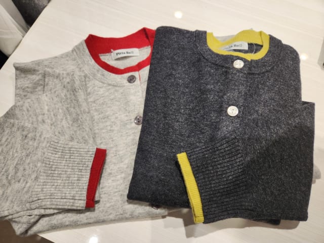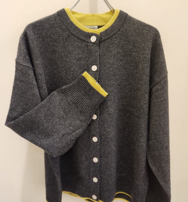 衿・袖・裾にバイカラーを用いて レイヤード風にしたカーディガン。