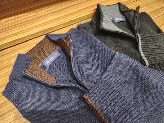 スタンド衿が暖かさをアップしてくれる 秋冬に重宝する一着は、ハイゲージの 滑らかな肌ざわりで着心地感◎。